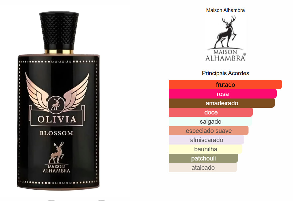 Olivia Blossom de Maison Alhambra é um perfume Floral Feminino. Olivia Blossom foi lançada em 2022. As notas de topo são: Rosa Damascena e Pimenta Rosa. As notas de coração são: Groselha Preta, Pera e Sorvete. As notas de fundo são: Sal, Cashmeran, Patchouli e Baunilha.